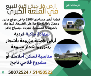 أرض فلاحية مساحتها 2800 م² تقع في القلعة الكبرى، على طريق معبد، تبعد حوالي 15 دقيقة عن وسط المدينة.